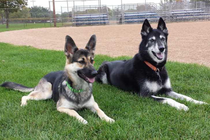 Deux Shepsky allongé sur une surface gazonnée et portant tous deux un collier autour du cou