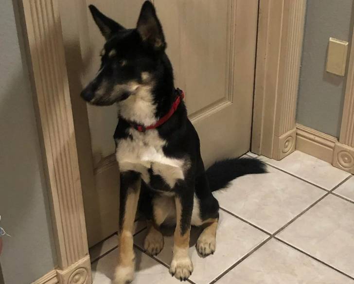 Un Shepsky assis devant une porte et portant un collier autour du cou