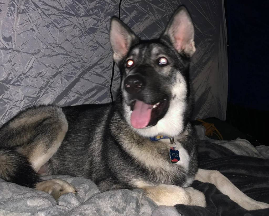 Un Shepsky tirant la langue et portant un collier autour du cou