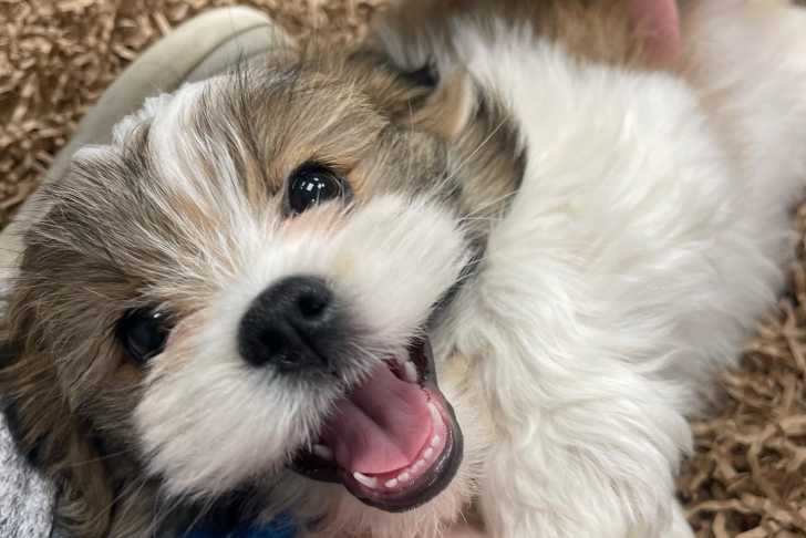 Un Shi-Mo de pelage bicolore, allongé dans un champ d'herbe verte, gueule ouverte et qui semble s'amuser