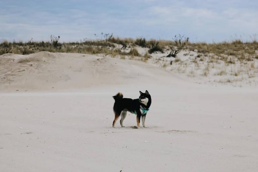 Un Shiba Inu sur une surface sableuse et portant un harnais
