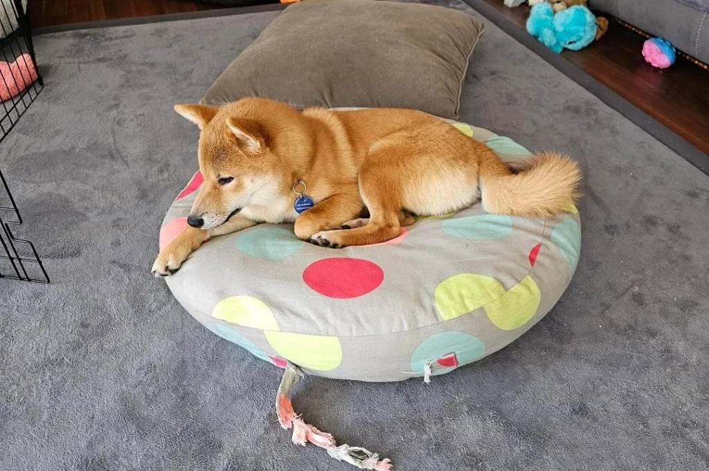 Un Shiba Inu allongé sur un lit pour chien et portant un collier autour du cou