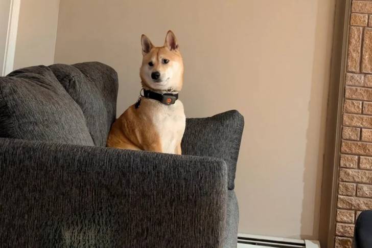 Un Shiba Inu assis sur un canapé et portant un collier autour du cou
