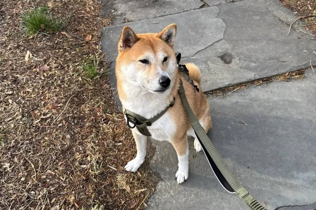 Un Shiba Inu assis sur une surface bétonnée et qui est tenu en laisse
