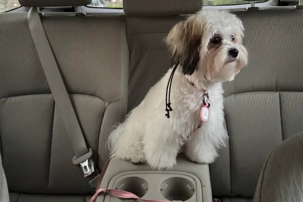 Un Shichon assis dans un véhicule