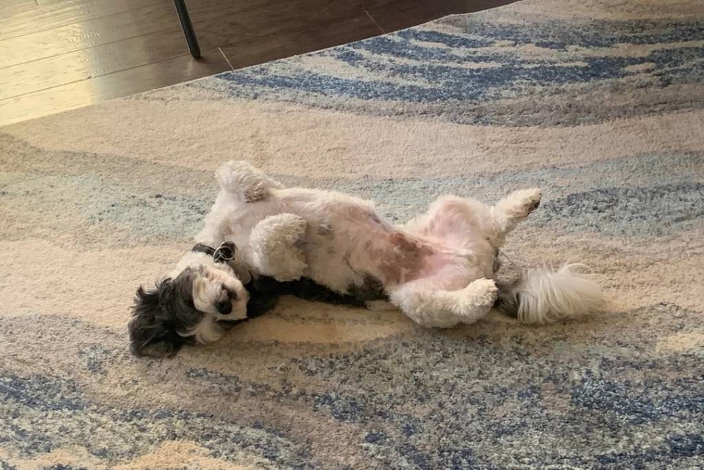 Un Shichon allongé de dos sur un tapis