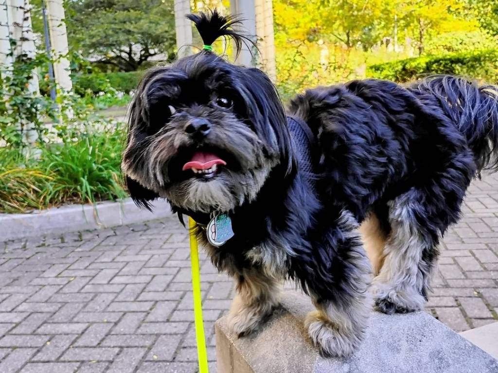 Un Shichon tenu en laisse et portant un collier autour du cou