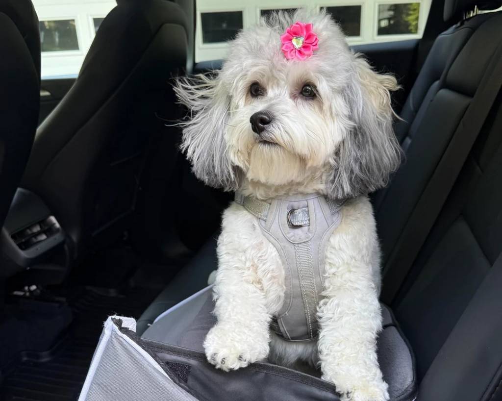 Un Shichon assis dans un véhicule