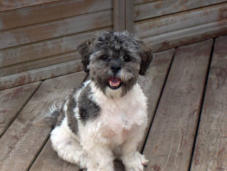Un Shih-Poo blanc et gris assis sur une terrasse