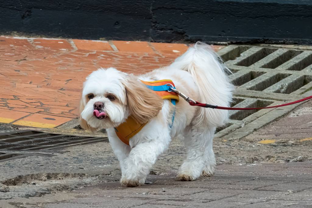 Un Shih Tzu tenu en laisse au cours d'une promenade
