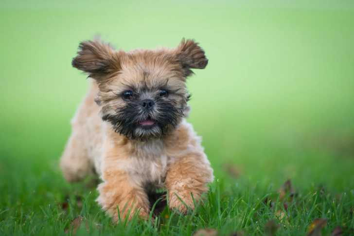 Un Shih Tzu courant sur un terrain herbeux et ayant la gueule légèrement ouverte