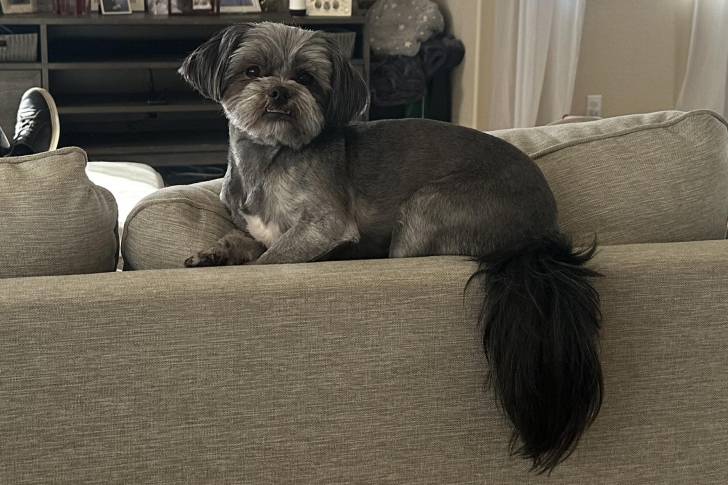 Un Shih Tzu assis sur un canapé et regardant vers la caméra