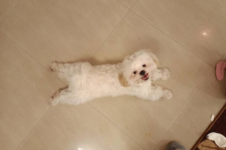 Un Shih Tzu allongé sur un sol carrelé et regardant vers la caméra
