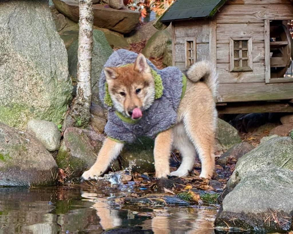 Un Shikoku Ken au bord de l’eau entre des rochers