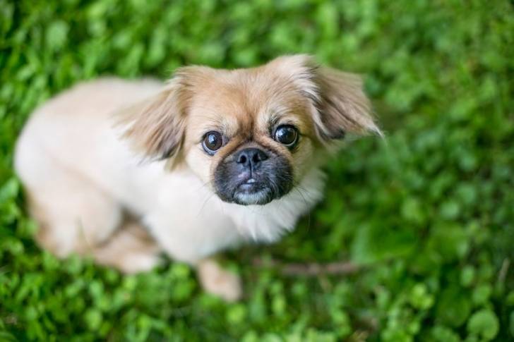 Un Shinese assis sur une suface herbacée et regardant vers la caméra