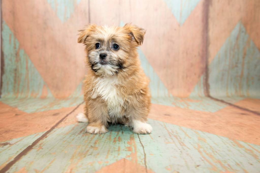 Un chiot Shiranian aux oreilles tombantes et au pelage mi-long fauve, blanc et noir