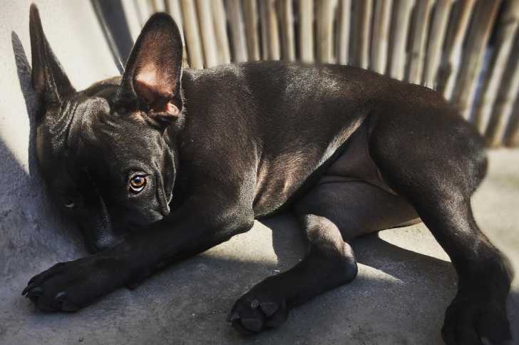 Un petit Shorty Bull au pelage noir et aux oreilles dressées, allongé en regardant la caméra.