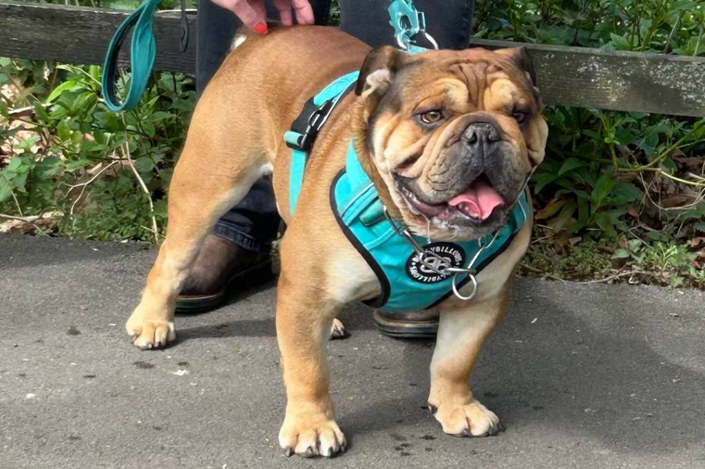 Un Shorty Bull sur un sol bétonné portant un harnais et tenu en laisse