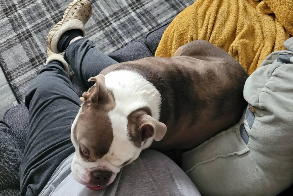 Un Shorty Bull assis sur un canapé à côté d'une personne