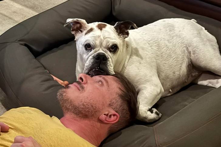 Un Shorty Bull allongé dans un panier et étant au contact de son maître