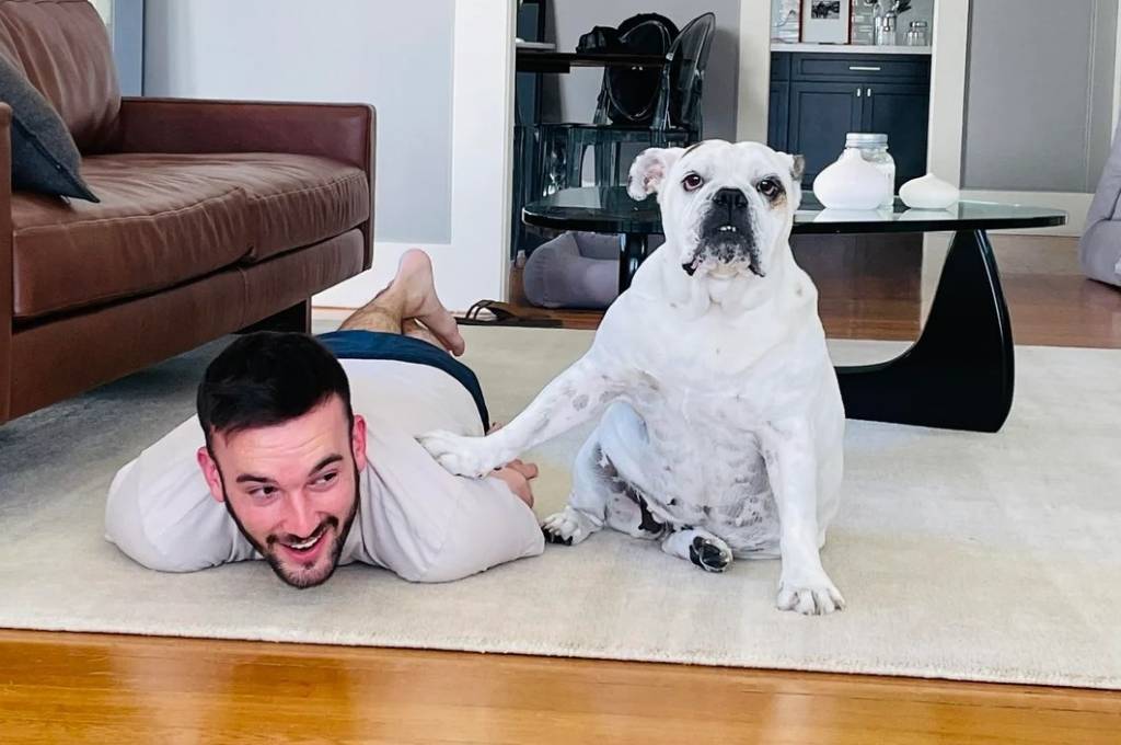 Un Shorty Bull assis et ayant une patte posée sur son maître