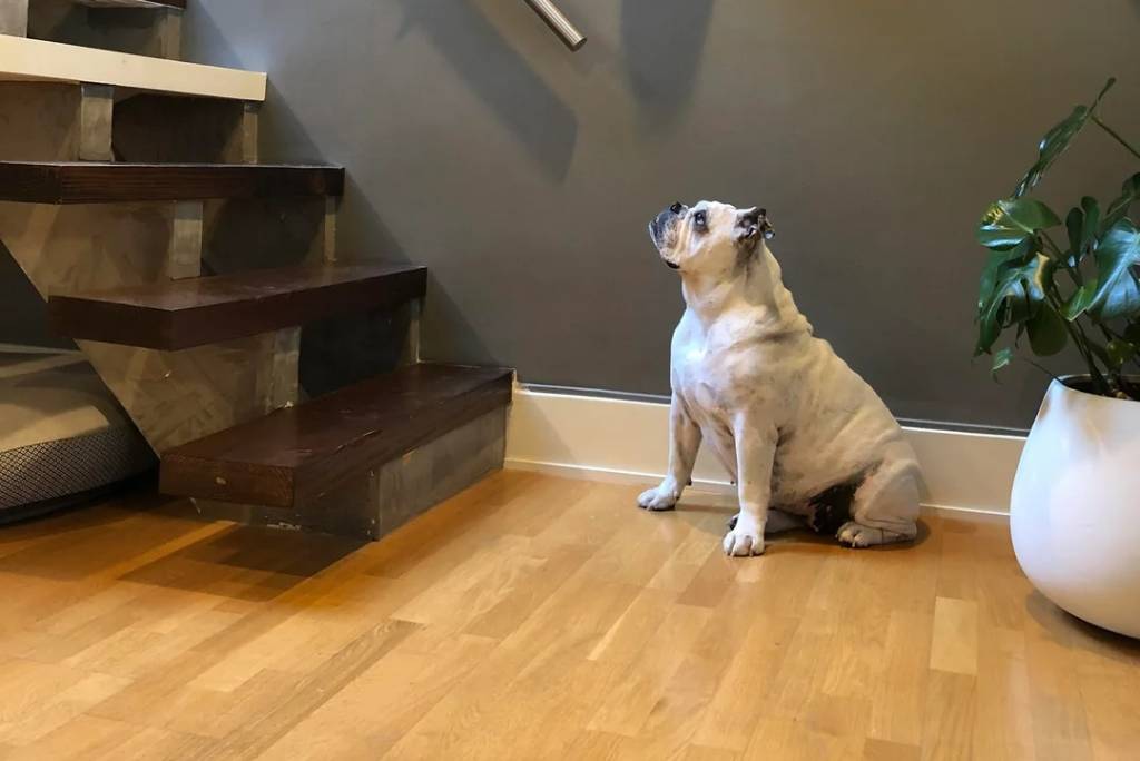 Un Shorty Bull assis sur un plancher et regardant vers un escalier