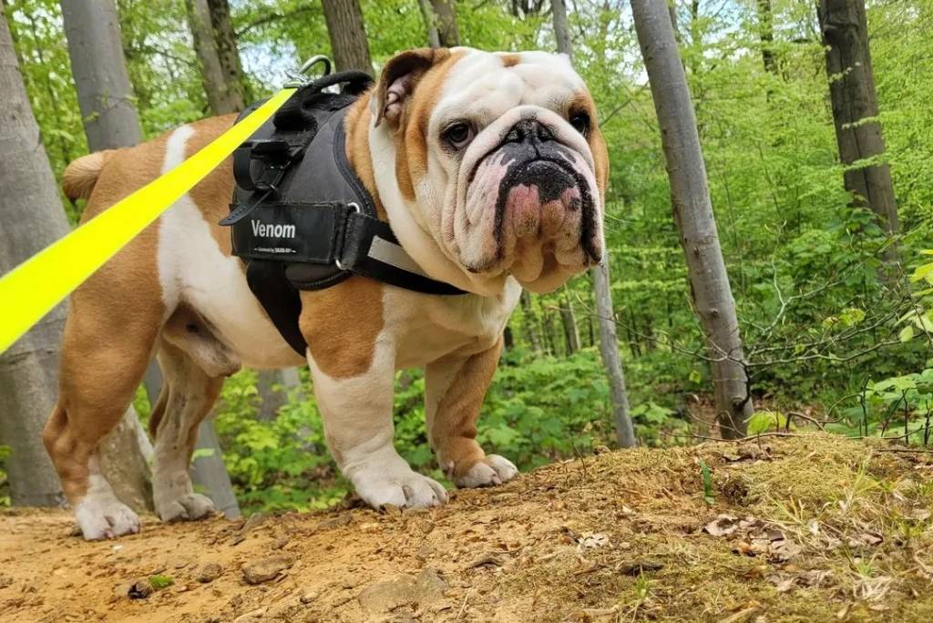 Un Shorty Bull portant un harnais et tenu en laisse
