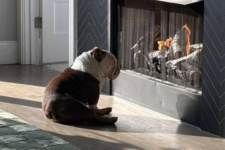 Un Shorty Bull assis sur un plancher en bois