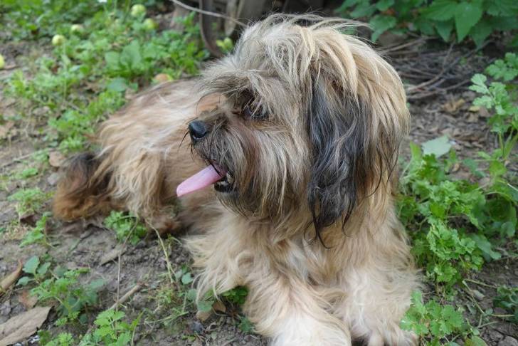 Un Silky Tzu allongé sur une surface herbacée et tirant la langue
