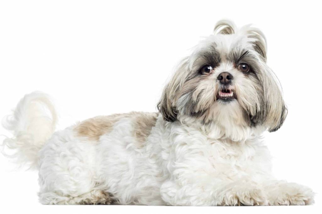 Un Silky Tzu allongé et ayant la gueule légèrement ouverte
