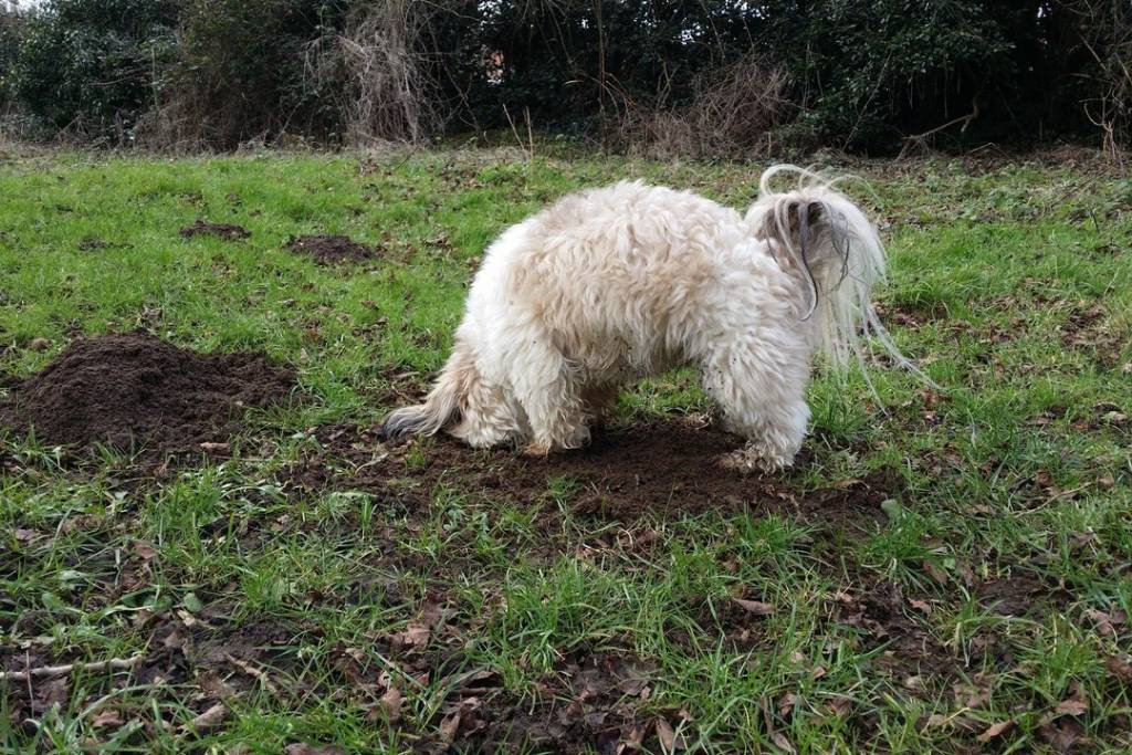 Un Silky Tzu sur un terrain herbeux et renifant le sol