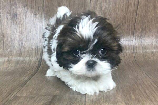 Un Silky Tzu allongé sur une chaise en bois et regardant vers la caméra