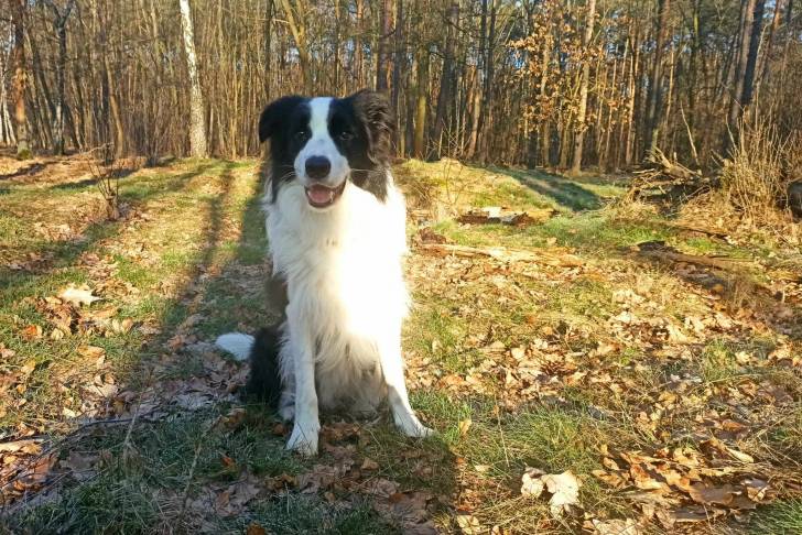 Un Ski-Border assis sur une surface herbacée et ayant la gueule légèrement ouverte