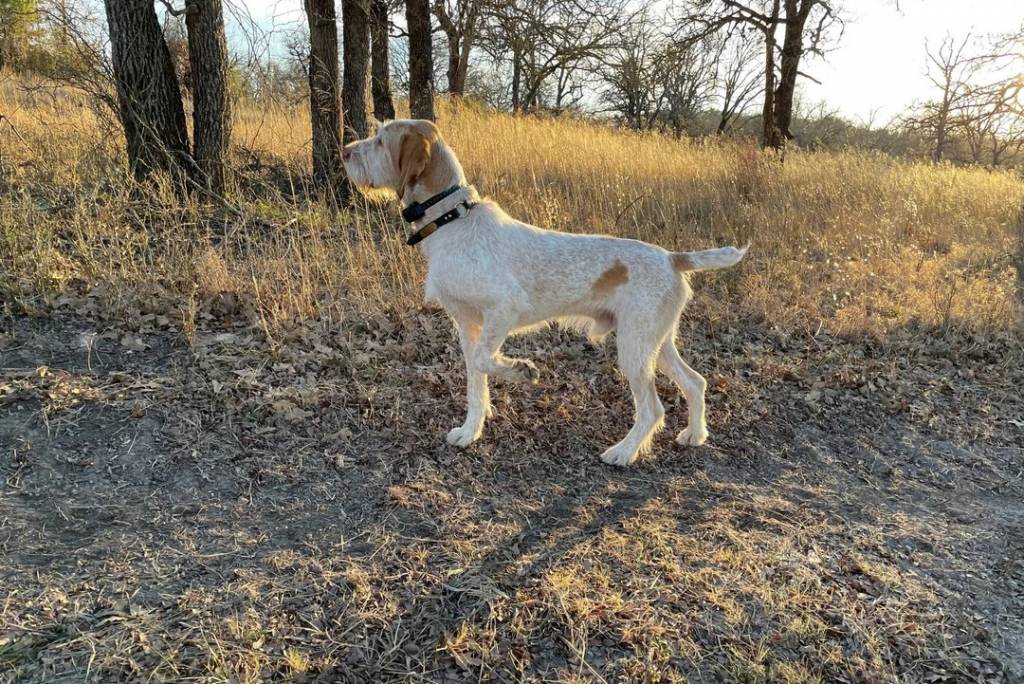 Un Spinone Italiano sur une surface herbacée et portant un collier autour du cou