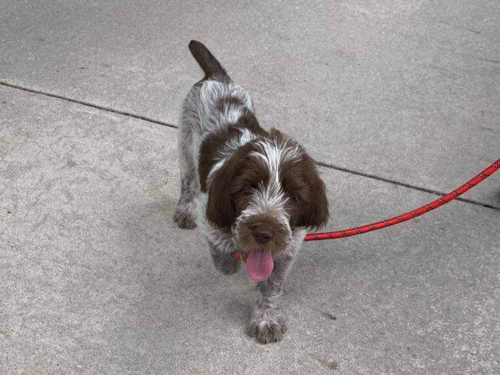 Un Spinone Italiano tirant la langue et qui est tenu en laisse