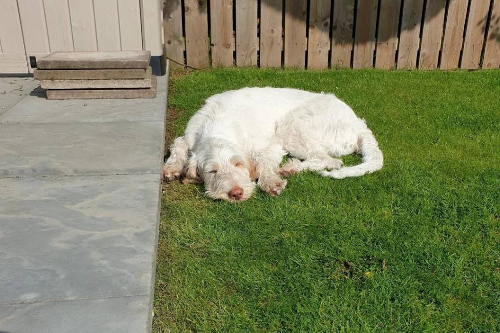 Un Spinone Italiano allongé sur une surface gazonnée et semblant détendu