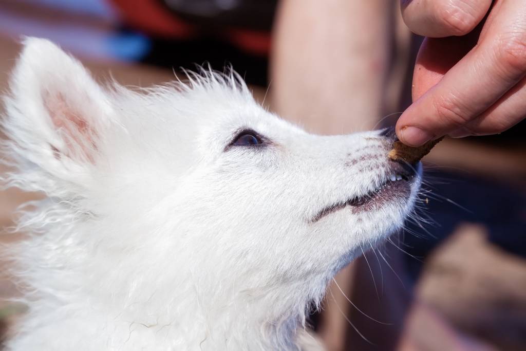 Un Spitz Japonais essaie d'attraper une balle dans l'eau