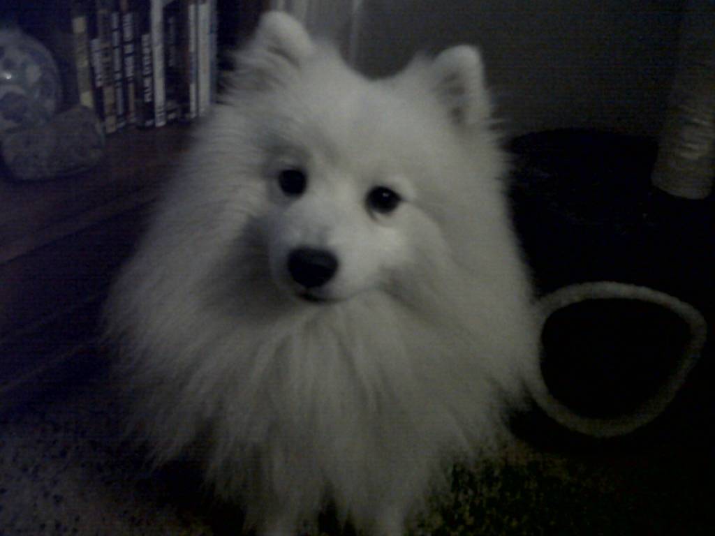 Un Spitz Japonais essaie d'attraper une balle dans l'eau