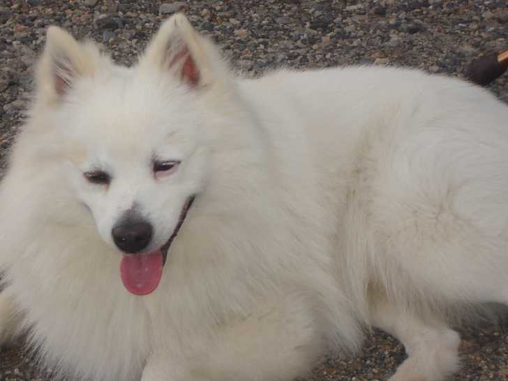 Un Spitz Japonais essaie d'attraper une balle dans l'eau