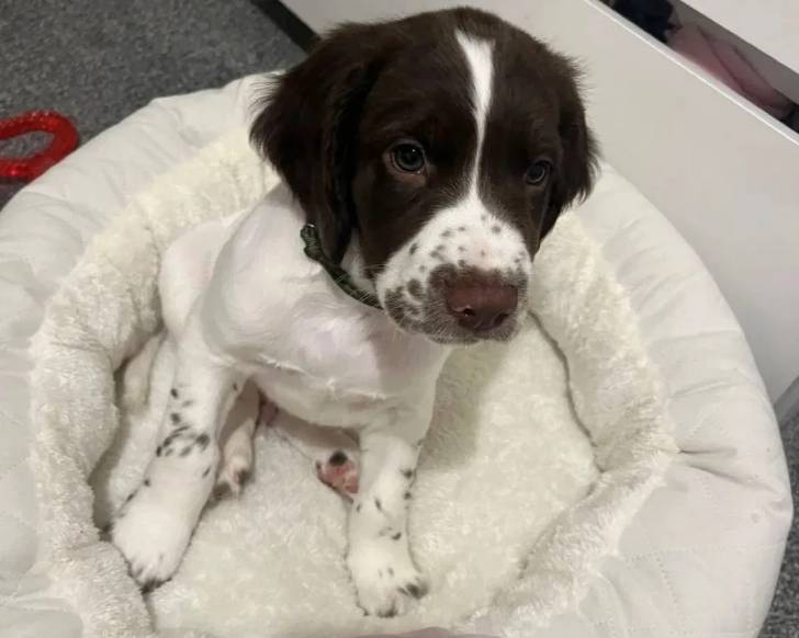 Un chiot Springer Anglais assis dans un panier et portant un collier autour du cou