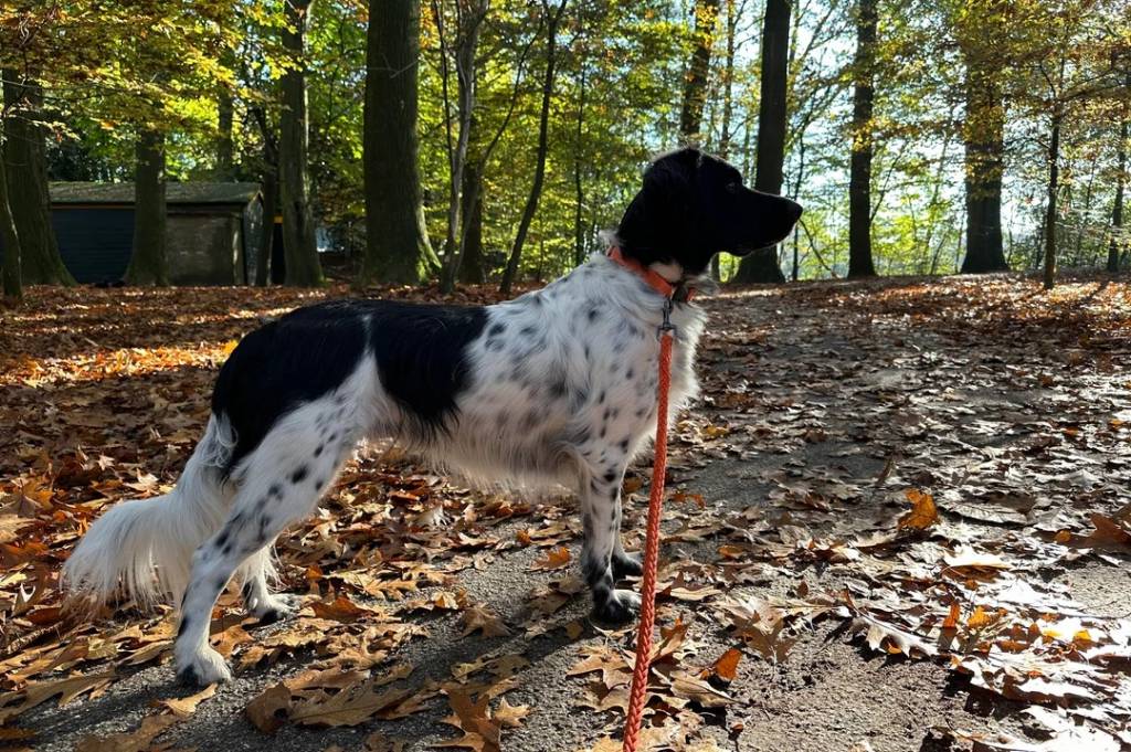 Un Stabyhoun sur un sol jonchés de feuilles mortes et qui est tenu en laisse