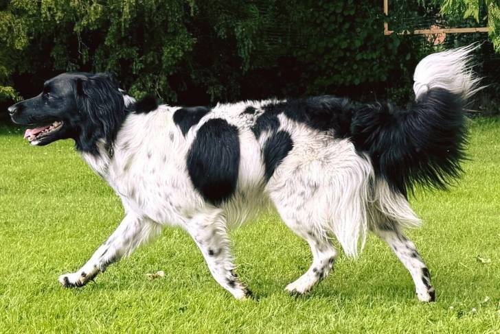 Un Stabyhoun marchant sur une surface gazonnée