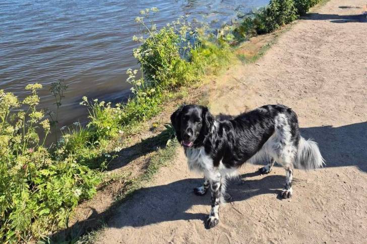 Un Stabyhoun sur une berge et regardant vers la caméra