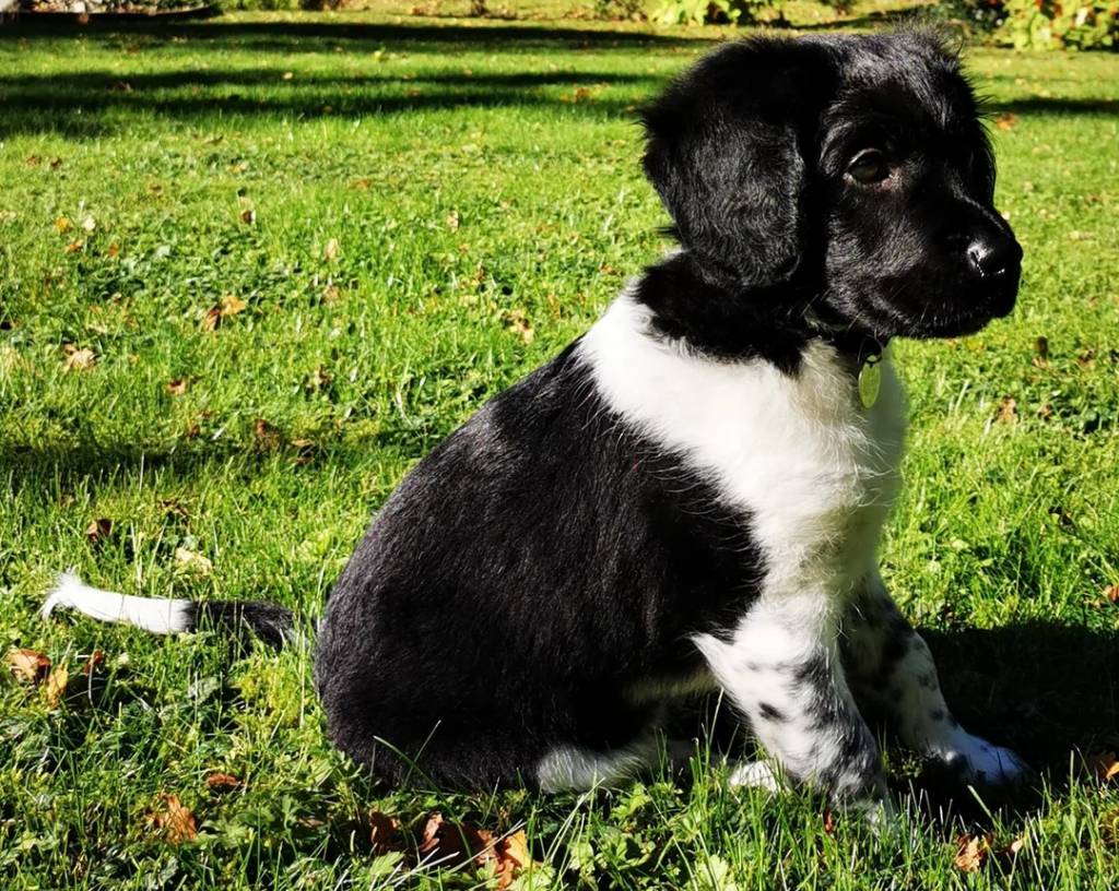 Un Stabyhoun assis sur un terrain herbeux et portant un collier autour du cou