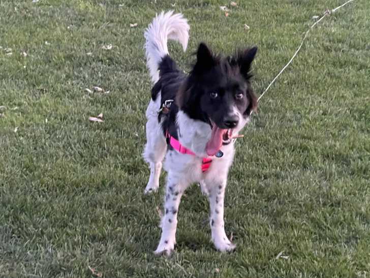 Un Stabyhoun sur une surface herbacée et ayant la langue pendante