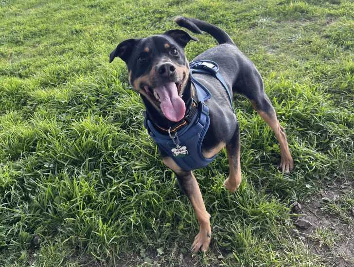 Un Staffweiler ayant la langue pendante et portant un harnais