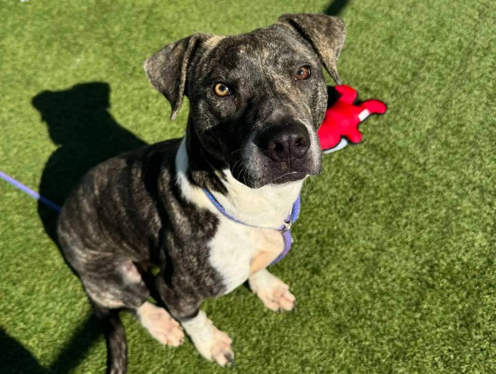 Un Staffweiler assis sur une surface géonnée et qui est tenu en laisse