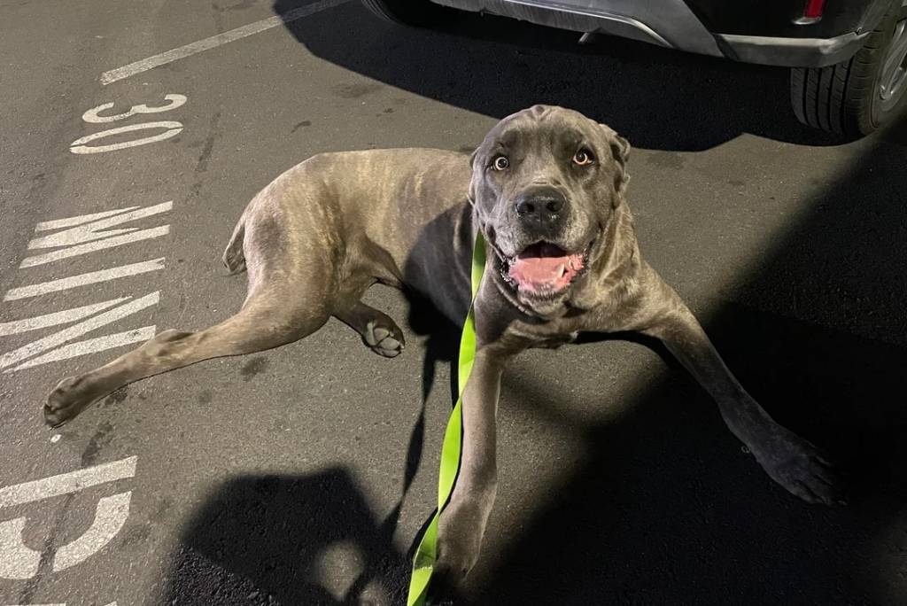 Un Staffweiler allongé sur une surface goudronnée et qui est tenu en laisse