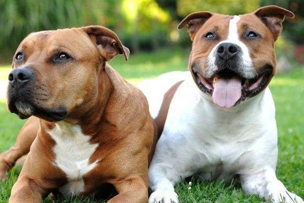 Deux Staffy Bull Pei aux pelages bicolores, allongés sur une surface herbacée, l'un tirant la langue et l'autre ayant la gueule fermée