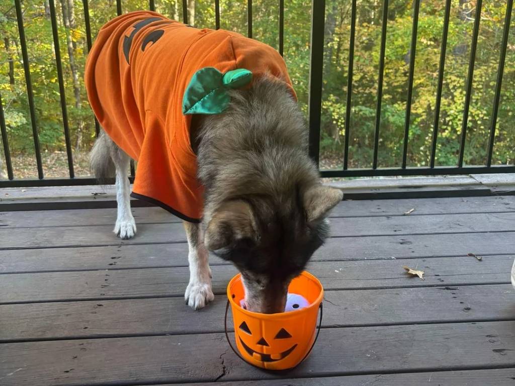 Un Tamaskan sur un plancher en bois et mangeant dans sa gamelle